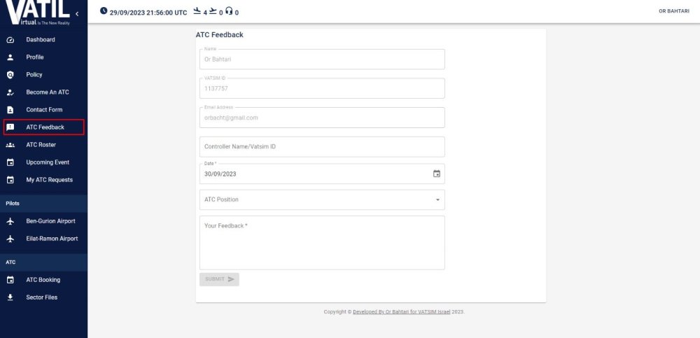 שלום לכולם, הוסף אזור חדש בדשבורד - *ATC Feedback* פעם הבאה שתטוסו, נשמח לשמוע על החוויה שלכם מהפיקוח בואטיל. אנחנו תמיד בשאיפה להשתפר! כמובן שגם משוב חיובי - מבורך! https://dashboard.vatil.org.il/atcfeedback