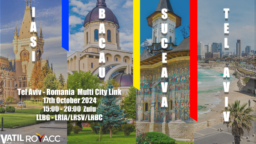 טייסים יקרים! אנו שמחים להזמין אתכם לאירוע אשר יתקיים ביום חמישי בתאריך ה-17/10/24 בין השעות 15:00 זולו ל-20:00 זולו (18:00 עד 23:00 שעון מקומי). אבל, שימו לב כי יש כאן טוויסט מעניין! אירוע ראשון מסוגו בחטיבה הישראלית! רק ברגע שתהיו באוויר, ממש במהלך הטיסה, אתם תדעו לאן אתם טסים! אתם יכולים לנחות בכל אחד מהשדות הבאים: LRIA/LRSV/LRBC ורק הפקחים ברומניה יקבעו לכם בהתאם לסוג מטוס, חניות בשדה ותנועות באוויר לאיפה תגיעו! בכדי לטוס באירוע, תצטרכו להכין את שלושת הסינרים באירוע כדי למנוע מצב של נחיתה ללא סינרי ובנוסף בFMC להכניס את אחד השדות שמשתתפים באירוע אבל רק עד הנקודה האחרונה בנתיב המצוין מטה. במהלך האירוע יואר המרחב האווירי של ישראל ורומניה בפיקוח מלא. הנתיב לאירוע - אתם מכניסים בFMC את הנתיב הזה וגם בואטסים ובאוויר הפקחים הרומנים ייקחו אתכם לשדות שונים מבלי לדעת באיזה שדה אתם נוחתים. LLBG-LRXX SUVAS N128 TEZAK L324 SAFTA DCT TOMBI UA16 AYT UQ23 OSVEL UL619 MAKOL DCT LUGEB DCT FOCSA כמובן שאל על וירטואל גם מצטרפת! אירוע מהנה ומוצלח לכולם!